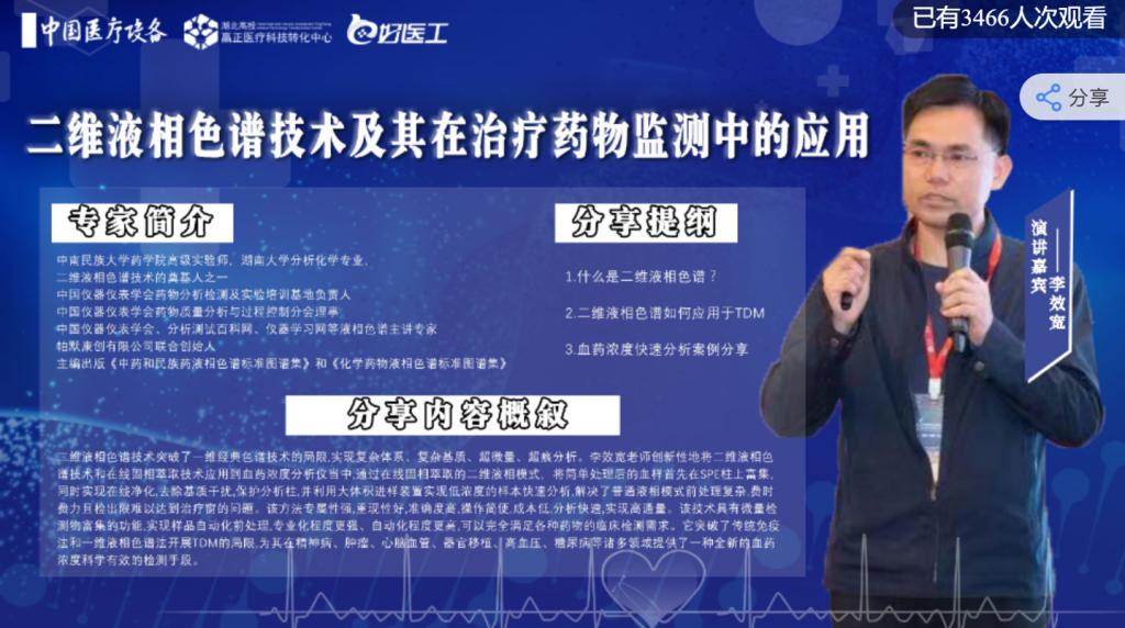 李效寬老師詳細(xì)介紹了二維液相色譜技術(shù)原理及其在治療藥物監(jiān)測(cè)中的應(yīng)用現(xiàn)狀和前景,該技術(shù)具有微量檢測(cè)物富集的功能,實(shí)現(xiàn)樣品自動(dòng)化前處理,專(zhuān)業(yè)化程度更強(qiáng)、自動(dòng)化程度更高,可以完全滿(mǎn)足各種藥物的臨床檢測(cè)需求。該技術(shù)的應(yīng)用解決了血藥濃度監(jiān)測(cè)前處理復(fù)雜,費(fèi)時(shí)費(fèi)力且難以達(dá)到治療窗的問(wèn)題,突破了傳統(tǒng)免疫法和一維色譜質(zhì)譜法開(kāi)展TDM的局限,為在精神病、腫瘤、心腦血管、器官移植、高血壓、糖尿病等諸多疾病治療領(lǐng)域提供了一種全新的血藥濃度科學(xué)有效檢測(cè)手段。李效寬老師主持開(kāi)發(fā)的高端血藥濃度分析儀器已經(jīng)獲得國(guó)家醫(yī)療器械注冊(cè)證書(shū),作為高端精密儀器替代進(jìn)口,服務(wù)于國(guó)家醫(yī)療民生健康的戰(zhàn)略安全需要。