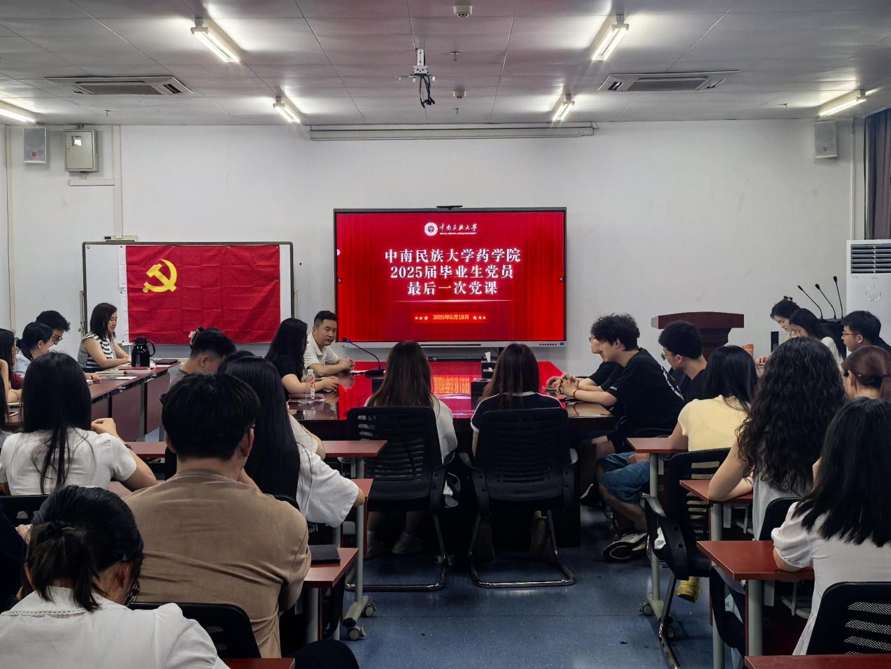 6月19日晚,藥學院在13203會議室為2025屆畢業生黨員舉辦“最后一次黨課”主題教育活動,通過“黨委書記講黨課+黨務實務講解+重溫入黨誓詞”的議程設計,為畢業生黨員系好走向社會的“第一粒扣子”。藥學院黨委書記楊春洪、全體專職輔導員及2025屆畢業生黨員參加活動。