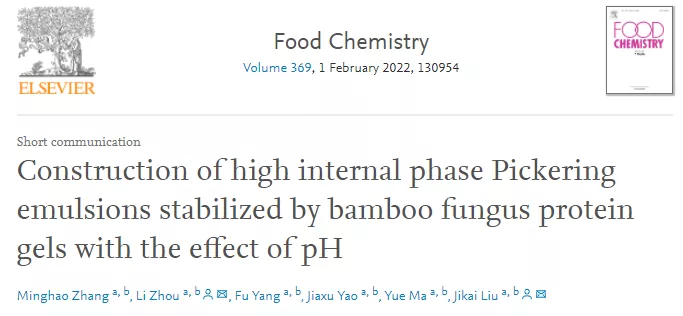 8月24日,中南民族大學藥學院研究人員在Food Chemistry在線發(fā)表題為“Construction of high internal phase Pickering emulsions stabilized by bamboo fungus protein gels with the effect of pH”的研究文章,在讀碩士研究生張明浩為論文第一作者,周莉副教授和劉吉開教授為通訊作者。