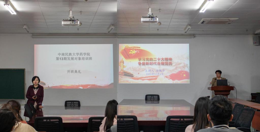 11月6日,藥學院在13-203舉行第十三期發展對象培訓班開班典禮暨第一次授課。開班典禮由藥學院2021級輔導員陳玲主持,授課由中華民族共同體研究院黨總支書記湯振華主講。