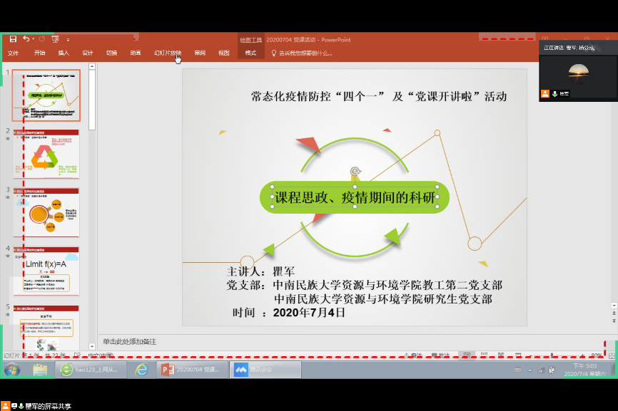(通訊員:嚴翼)為響應教育部思想政治工作司《在常態化疫情防控中加強高校基層黨建“四個一”行動方案》和湖北省委組織部《關于在全省開展“黨課開講啦”活動的通知》精神,根據學校及學院的安排部署,中南民族大學資源與環境學院教工第二黨支部和研究生黨支部于2020年7月4日共同開展了主題為“課程思政及疫情期間的科研”線上黨課及黨組織生活會,黨課主講人為教工第二黨支部書記瞿軍老師。