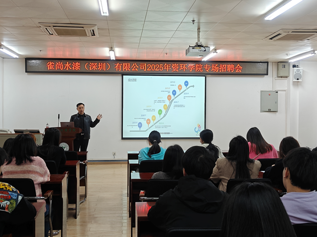為學生搭建就業橋梁,促進人才與企業精準對接。4月3日上午,我院在13號樓261報告廳舉辦專場招聘會,邀請雀尚水漆(深圳)有限公司進校宣講招聘。