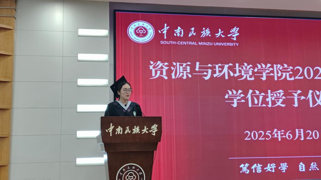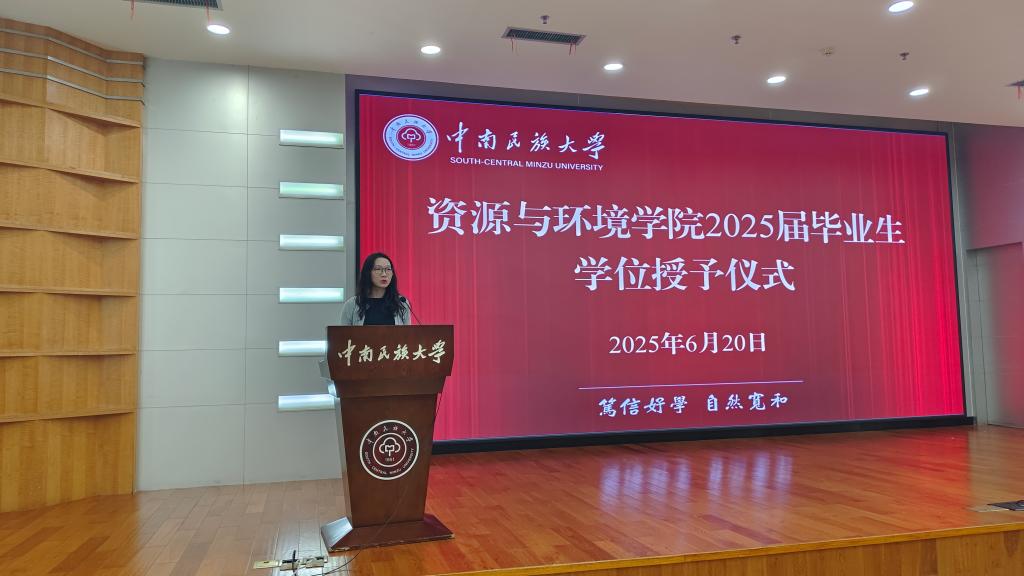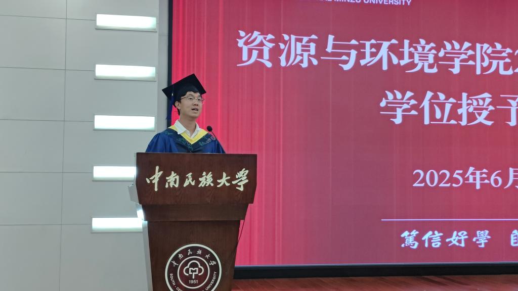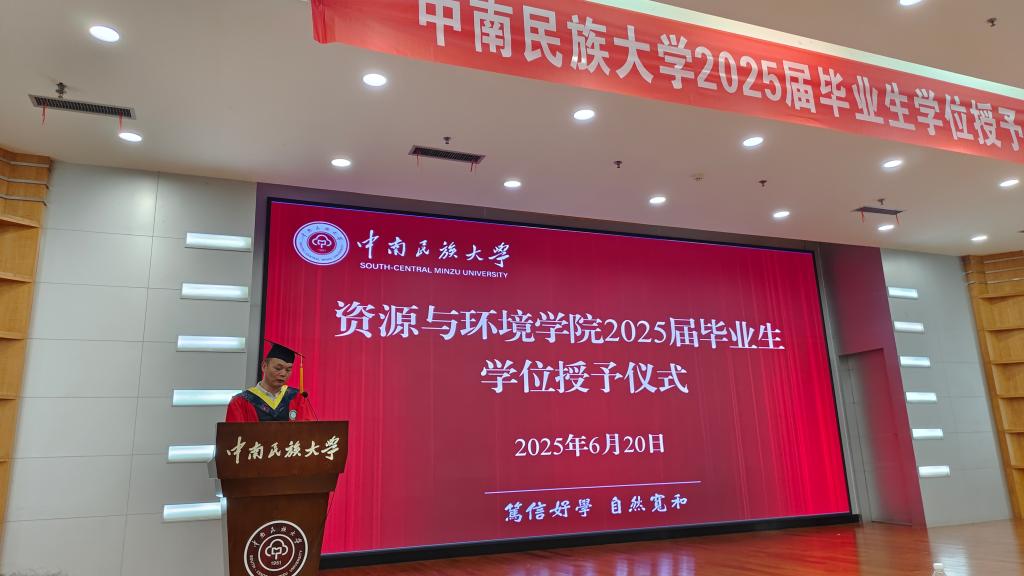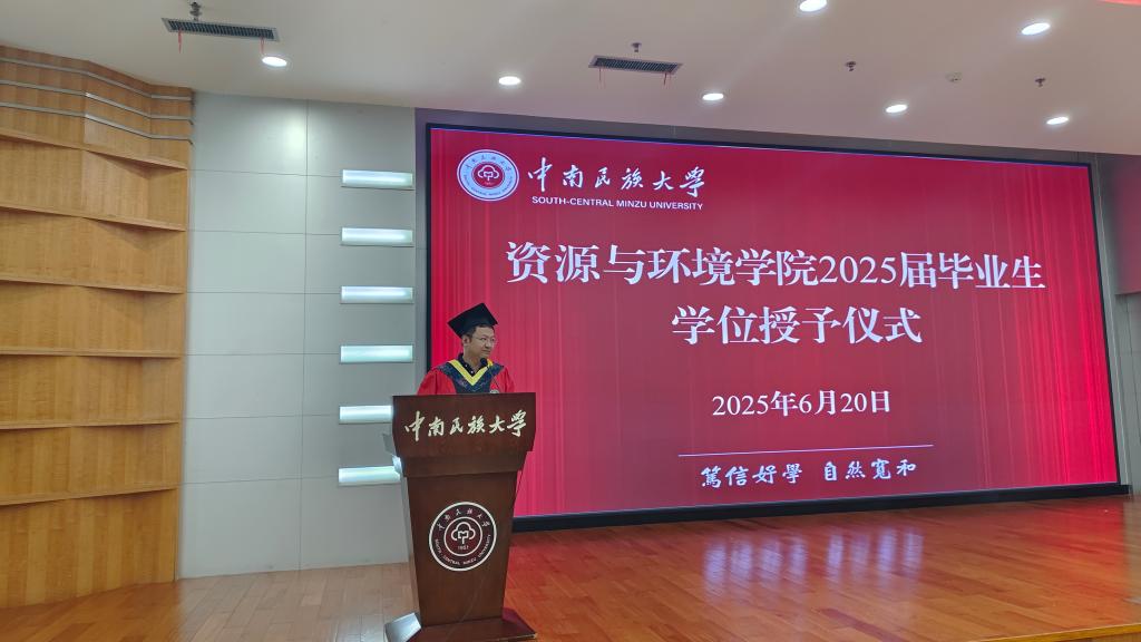 院長孫杰在致辭中,以院訓“崇德尚學,自然和諧”為引,勉勵畢業生恪守學術道德,永葆求知熱忱,以終身學習的姿態探索真理、踐行知行合一。他向全體畢業生致以熱烈祝賀,贊譽大家在學業生涯中潛心學術研究、突破自我局限的奮斗歷程。從踏入校園時的躊躇滿志,到如今滿載學識的青年才俊,畢業生們即將揮別母校,奔赴人生新征程。臨別之際,院長孫杰深情寄語,期望同學們在未來的學術道路與職業發展中堅守初心、勇毅前行,表示中南民族大學永遠是畢業生們溫馨的家,并宣讀關于授予學位的決定。