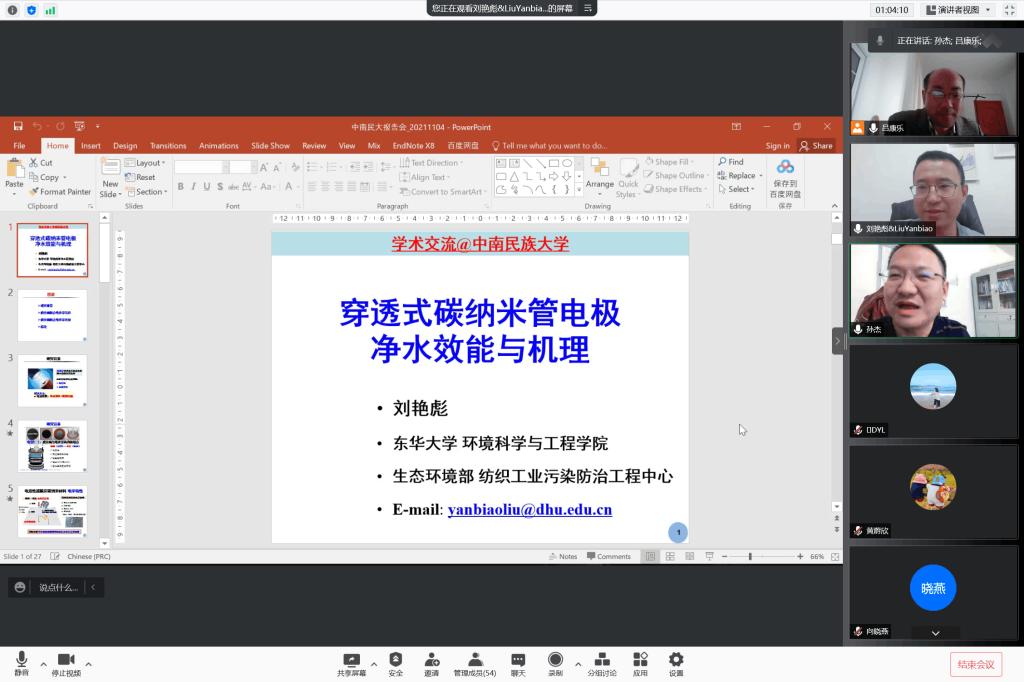 2021年11月4日下午,東華大學環境科學與工程學院教授劉艷彪老師應邀為我院師生做了題為《穿透式碳納米管電極凈水效能與機理》的線上學術講座。學術講座由呂康樂副院長主持,多名教師和40余名研究生同學參加。