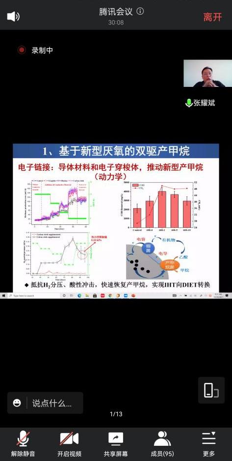 張耀斌教授首先就有機廢物、廢水的排放做了初步的介紹。報告主要圍繞有機廢物(水)厭氧發酵處理技術進行了詳細介紹,包括(1)基于新型厭氧的雙驅產甲烷技術;(2)厭氧消化中的原位脫氨單;(3)厭氧微生物胞外電子傳遞的強化。此外,張耀斌教授還就以上技術的工業應用案例進行了講解。