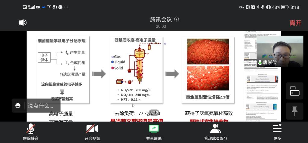 唐崇儉教授首先就課題組研究方向做了初步介紹,并歡迎感興趣的碩士研究生同學(xué)報考中南大學(xué)的博士研究生。隨后,唐崇儉教授向大家分享了課題組近年來所做的研究工作,主要內(nèi)容包括(1)厭氧氨氧化微生物脫氮及其調(diào)控;(2)厭氧氨氧化的工程應(yīng)用;(3)厭氧氨氧化顆粒污泥上浮模型;(4)厭氧氨氧化耦合Cr(VI)還原。此外,唐崇儉教授還就厭氧氨氧化過程中微生物的微觀調(diào)控過程進行了講解。
