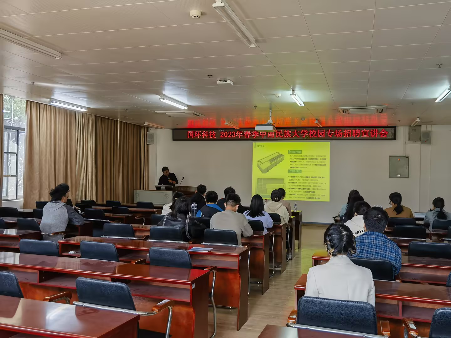 宣講會伊始,我校校友、國環科技總經理孫杰對公司背景、業務板塊等作了詳細介紹,對同學們最為關心的工作崗位、培養方案、晉升發展等方面進行了重點說明。國環科技是一家致力于水環境綜合治理的環保企業,涵蓋了市政及工業園給排水管網、高難度廢水、流域治理、農村人居環境綜合治理四大板塊的設計咨詢、總承包及托管運營。