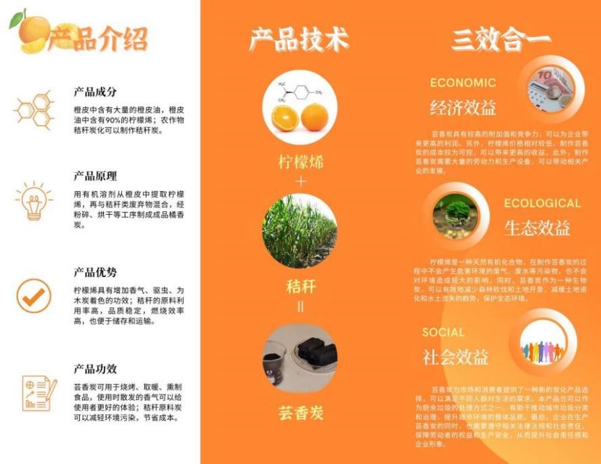 “蕓香益民”團隊組建之初便致力于開創一家集專業技術、生產銷售、電商運營于一體的現代化企業,致力于研發先進的機制木炭生產技術和生產銷售各種高級機制炭、燒烤專用炭等綠色環保產品,以期達到節能減排、發展新型生產產業、振興部分老舊產業的目的。隨著調研的不斷深入,技術的不斷成熟,本團隊也會將業務擴展至其他的環境類產品研發,利用其他蕓香科植物的廢棄果皮,其他的農林廢棄物進行產品研發與制備。