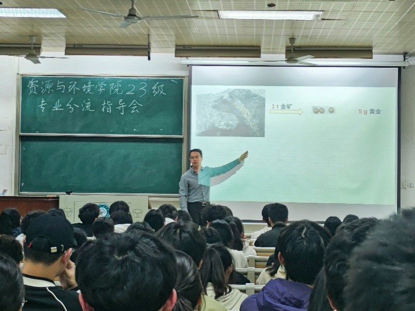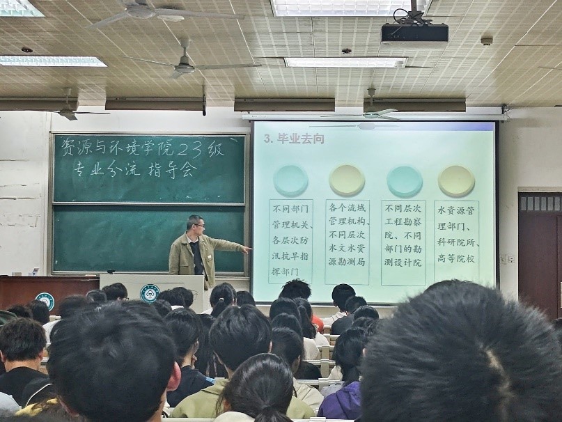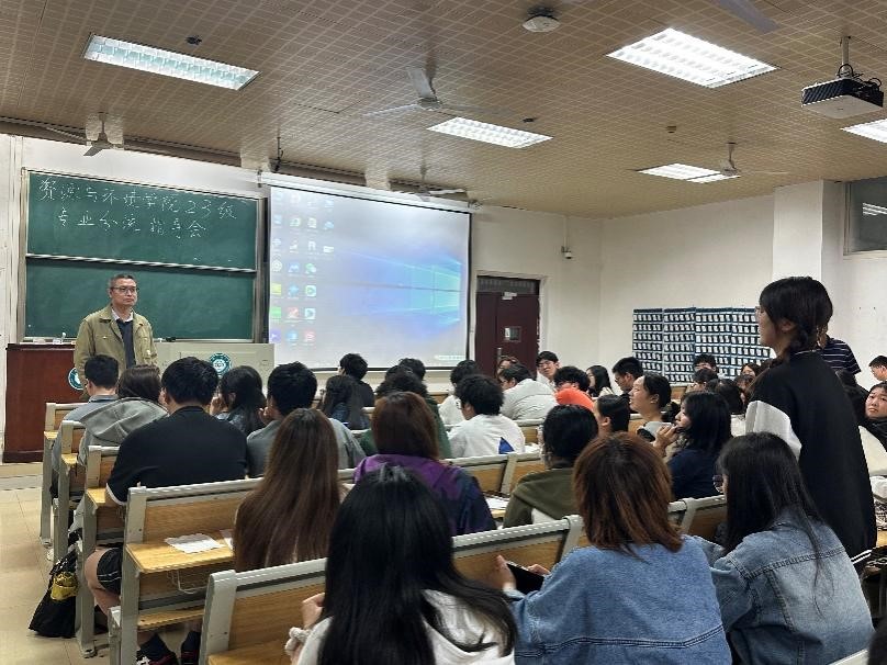 為做好學生專業分流工作,4月11日晚,資源與環境學院2023級專業分流宣講會在11-200室展開。學院黨委副書記藍永麗、副院長張俊宏、各教研室主任、23級班導師和輔導員、環境工程專業優秀學生代表汪嵐玢及23級全體學生參加會議。