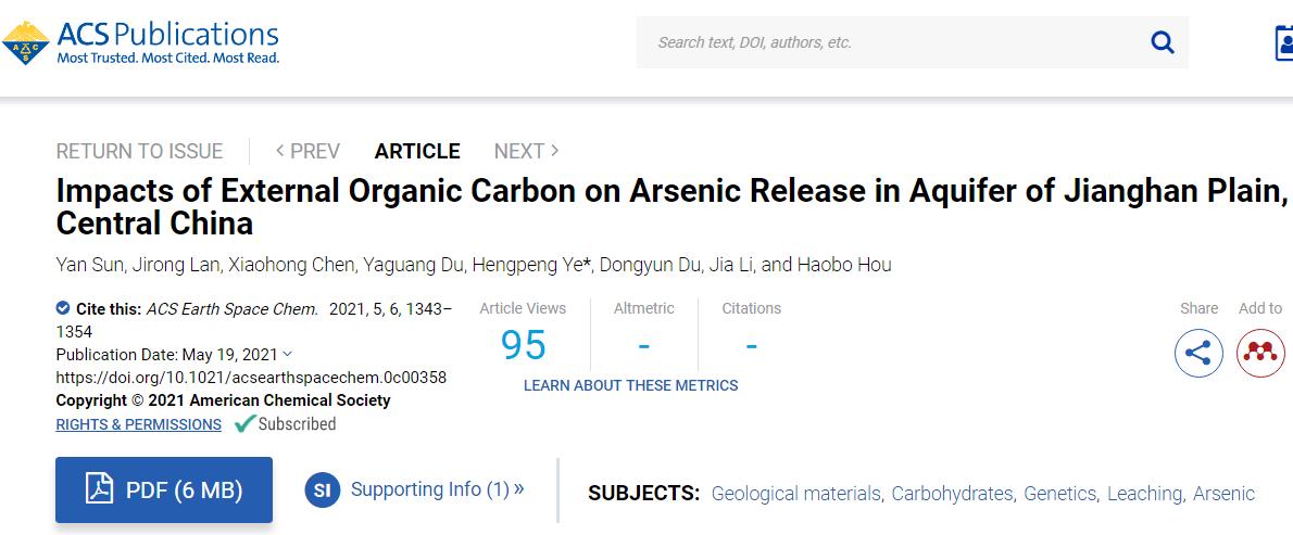 近期,我院杜冬云教授團隊在地球化學類期刊《ACS Earth and Space Chemistry》發表了題為《Impacts of external Organic Carbon on Arsenic Release in Aquifer of Jianghan Plain, Central China》的最新研究成果,并被評選為補充封面論文(Supplementary Cover Article)。研究生孫燕為該論文的第一作者,葉恒朋教授為通訊作者。