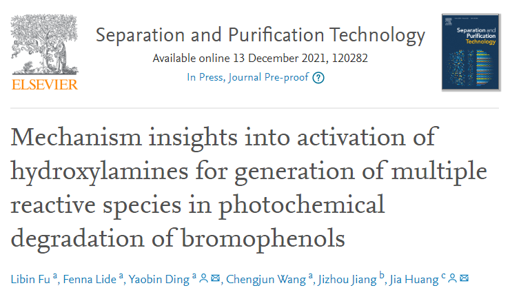 2021年9和12月,我院丁耀彬副教授在國際期刊《Separation and Purification Technology》發表了姊妹篇論文,揭示了溴酚光化學降解中的水合電子的關鍵作用及其羥胺活化機理。論文第一作者為我院研究生符麗彬,通訊作者為丁耀彬副教授。