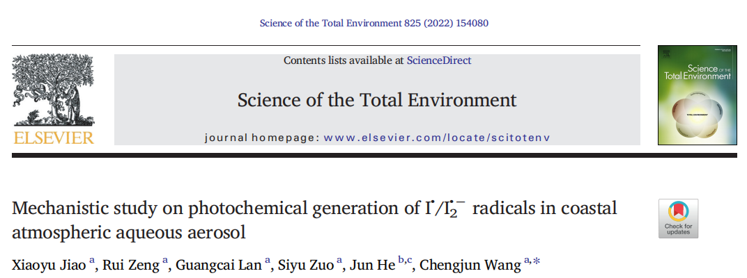 我院王成俊教授課題組在環境科學類期刊《Science of the Total Environment》發表了題為《Mechanistic study on photochemical generation of I?/I2?- radicals in coastal atmospheric aqueous aerosol》的最新研究成果,揭示了沿海氣溶膠水相中碘自由基I?與I2?-的光致生成機理。研究生焦嘯宇為該論文第一作者,王成俊教授為通訊作者。