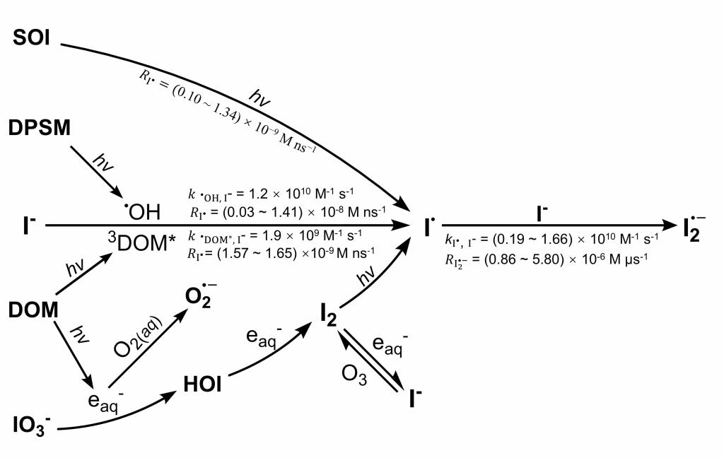 研究發現沿海氣溶膠水相中,不僅IO3-離子及從大氣中攝取的O3、H2O2等氧化劑可通過經典氧化還原反應氧化I-離子生成I2(aq),進而在太陽光照下通過I2(aq) + hv → 2I?和I? + I- → I2?- 反應生成I?/I2?-自由基,大氣氣溶膠中溶解性有機碘(SOI)直接光解及溶解性光敏物質(DPSM)如DOM、Fe(III)-絡合物、HONO/NO2-及NO3-離子等光致生成的活性物質3DOM*、?OH及水合電子eaq- 等也可通過直接氧化、能量轉移或電子轉移等方式活化無機碘離子I-或IO3-生成I?/I2?-自由基,基于LFP測得的不同反應途徑下I?/I2?-自由基的生成速率及相關光化學反應速率常數等,證實了光敏氧化反應是引發沿海氣溶膠水相中I?/I2?-自由基生成的主要途徑。