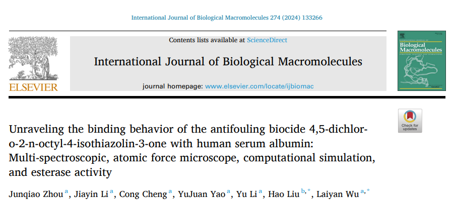 2024年6月,我院碳與環境修復團隊在化學領域權威期刊《International Journal of Biological Macromolecules》(中科院一區 TOP)上發表最新研究成果:Unraveling the binding behavior of the antifouling biocide 4,5-dichloro-2-n-octyl-4-isothiazolin-3-one with human serum albumin: Multi-spectroscopic, atomic force microscope, computational simulation, and esterase activity,首次解析Sea-Nine 211防污劑主成分——4,5-二氯-2-正辛基-3-異噻唑啉酮(DCOIT)與人體主要轉運蛋白——人血清白蛋白(HSA)的相互作用。我院碩士研究生周俊鍬為論文第一作者,吳來燕副教授為論文通訊作者。