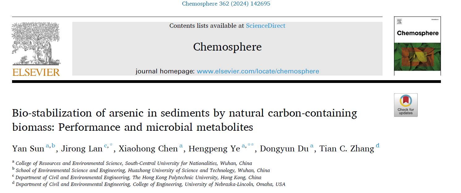 2024年6月23號,我院杜冬云教授團隊葉恒朋教授在《Chemosphere》(中科院二區TOP,影響因子8.1)發表了題為《Bio-stabilization of arsenic in sediments by natural carbon-containing biomass: Performance and microbial metabolites》的最新研究成果。我院研究生孫燕(現華中科技大學博士生)為第一作者,葉恒朋教授和香港理工大學藍際榮助理研究員為論文通訊作者,中南民族大學為成果的第一單位。