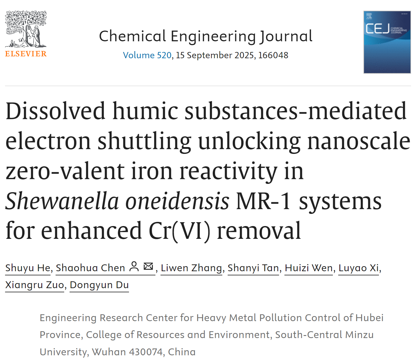 近日,我校杜冬云教授課題組在化工和環(huán)境工程領(lǐng)域權(quán)威期刊《Chemical Engineering Journal》(中科院一區(qū)TOP,IF=13.2)上發(fā)表最新研究成果:Dissolved humic substances-mediated electron shuttling unlocking nanoscale zero-valent iron reactivity inShewanella oneidensisMR-1 systems for enhanced Cr(VI) removal,其中我校資環(huán)學(xué)院碩士研究生何淑玉為論文第一作者,陳紹華副教授為論文通訊作者,中南民族大學(xué)為唯一通訊單位。