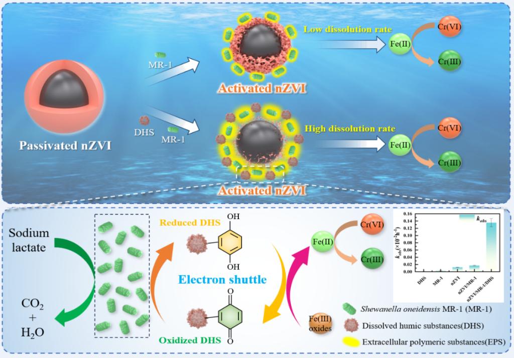 目前主要采用化學(xué)法改性nZVI來抑制鈍化層的形成,成本高、易產(chǎn)生二次污染。該研究則采用微生物方法來解決nZVI表面鈍化問題,即基于異化鐵還原菌可利用nZVI表面鈍化層中鐵氧化物為電子受體,將其還原成可溶Fe(II),以此解決nZVI在反應(yīng)過程中表面鈍化問題,并利用天然環(huán)境中的溶解性腐殖質(zhì)(DHS)為電子穿梭體進(jìn)一步加速鈍化層溶解,從而長(zhǎng)時(shí)間維持nZVI的活性。此外,生成的活性Fe(II)是一種較強(qiáng)的還原劑,可以繼續(xù)還原Cr(VI),從而實(shí)現(xiàn)水體中Cr(VI)的高效、快速去除。同時(shí)研究還構(gòu)建了DHS的分子結(jié)構(gòu)和Cr(VI)去除速率常數(shù)之間的定量關(guān)系。這項(xiàng)研究提出一種高效、低成本、環(huán)境友好解決nZVI表面鈍化層的新方法,應(yīng)用前景廣闊。該技術(shù)通過微生物方法解決nZVI在實(shí)際應(yīng)用過程中易鈍化的瓶頸問題,為推動(dòng)nZVI修復(fù)技術(shù)的大規(guī)模應(yīng)用奠定基礎(chǔ)。