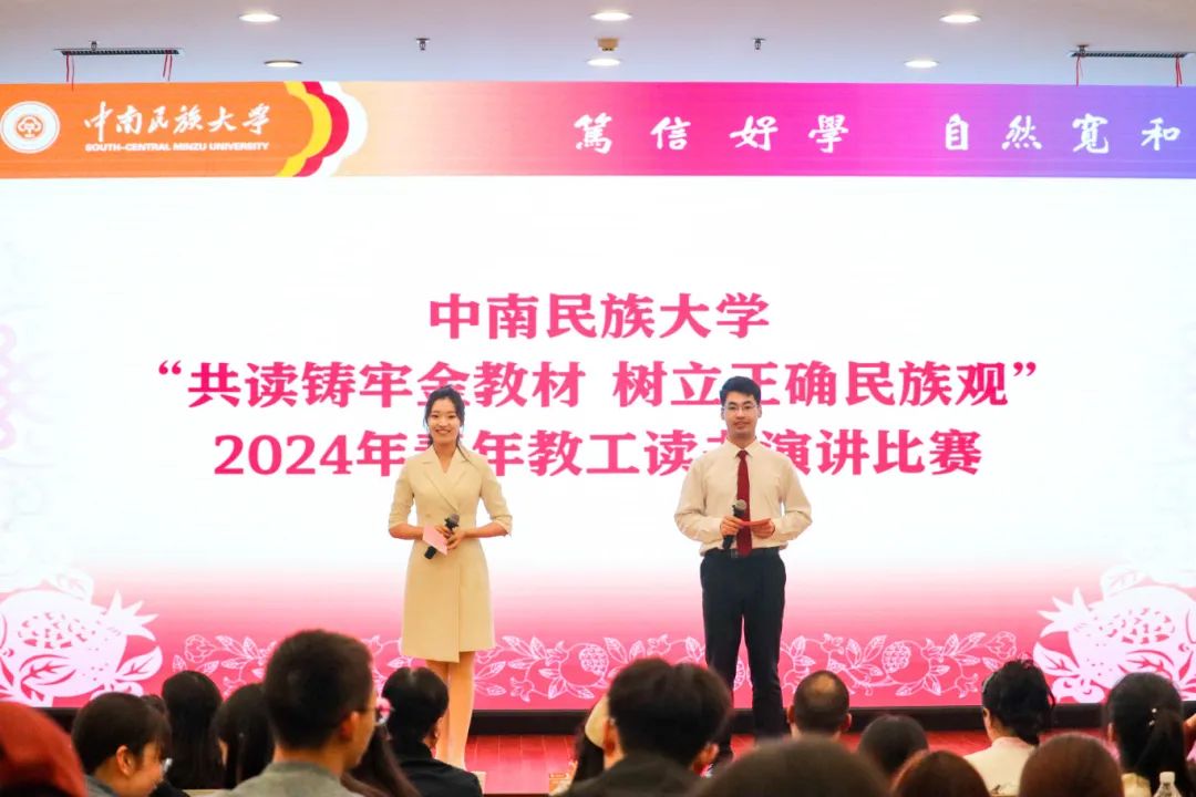 4月11日,“共讀鑄牢金教材,樹立正確民族觀”2024年青年教工讀書演講比賽在學術交流中心舉行。來自13個單位的15位青年教師圍繞《中華民族共同體概論》教材分享心得感悟。湖北省演講協會副會長陳飛,國家三級導演何苗,校團委、黨委教師工作部、工會、中華民族共同體學院、馬克思主義學院相關老師擔任本次比賽評委。校黨委常委、副校長李紅燕出席并講話。